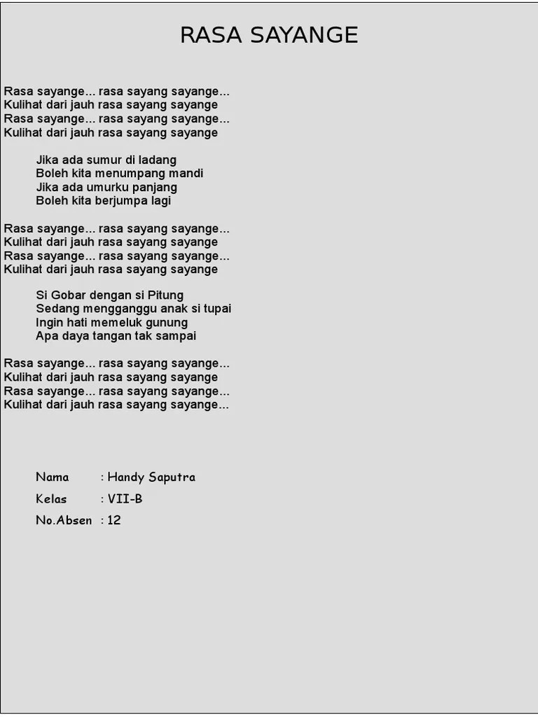 Rasa sayange, rasa sayang sayange eh lihat dari jauh, rasa sayang sayange rasa sayange, rasa sayang. Huruf cetak tebal dinyanyikan sceara bersama · highlighter warna bagian yang dinyanyikan · rasa sayange, rasa sayang sayange (lula). Makna lagu ini menceritakan tentang rasa sayang masyarakat maluku terhadap lingkungan.